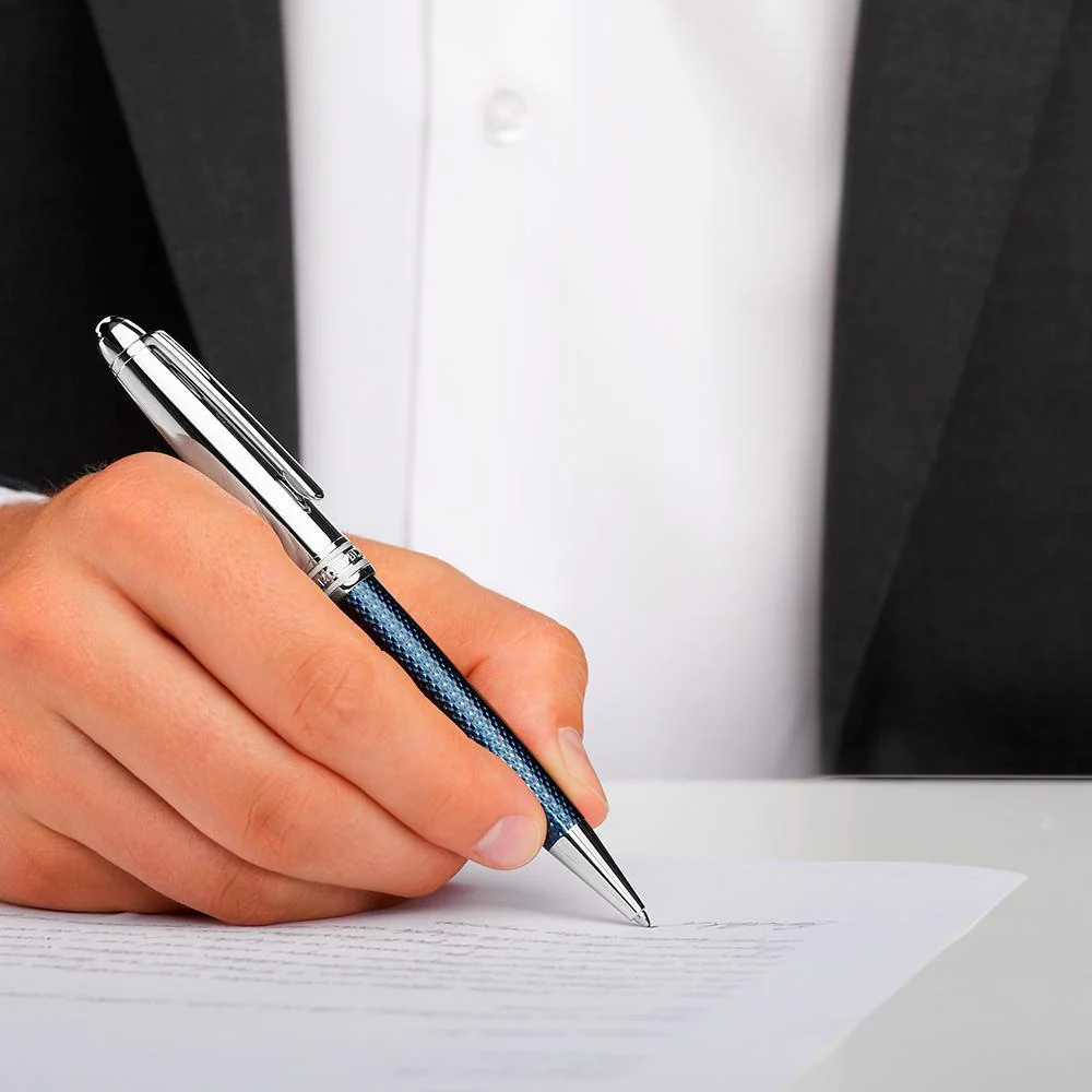 Montblanc Meisterstück Blue Hour collection is inspired by the magical hour between daylight and night – the Blue Hour – when the city lights sparkle across the skyline as the sun sets. The luxury ballpoint features a barrel with engraved hexagon pattern covered by translucent deep blue lacquer. The polished platinum coated cap is crowned by the iconic white Montblanc emblem and three rings embossed with the Montblanc brand name.